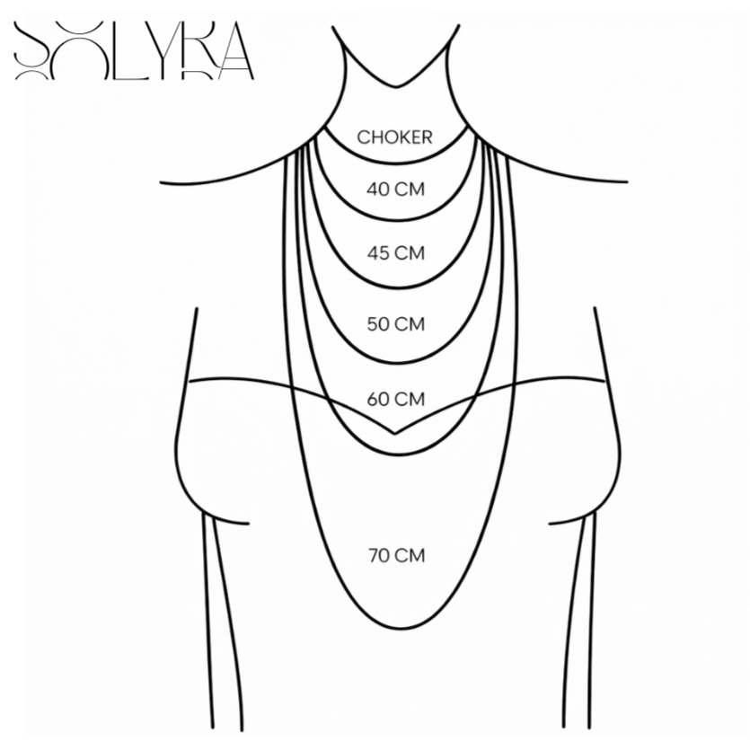 Dica SOLYRA: Para escolher o tamanho ideal, meça seu pescoço com uma fita métrica flexível e visualize onde deseja que o colar fique. Assim você garante conforto, proporção e um visual ainda mais marcante.